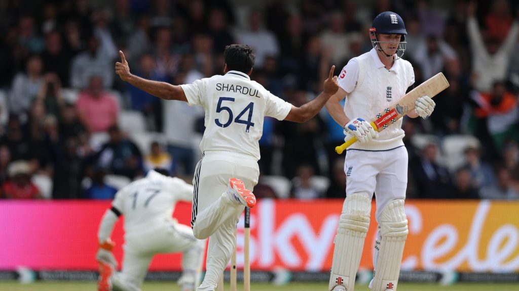 എന്നാൽ, രണ്ടാം സെഷനിൽ തുടർച്ചയായ വിക്കറ്റുകൾ വീഴ്ത്തി ഇന്ത്യ മത്സരത്തിലേക്ക് ശക്തമായി തിരിച്ചെത്തി. പ്രസിദ്ധ് കൃഷ്ണ ക്രൗളിയെയും ഓലി പോപ്പിനെയും പുറത്താക്കിയപ്പോൾ, ഷാർദുൽ താക്കൂർ ഡക്കറ്റിനെയും ഹാരി ബ്രൂക്കിനെയും അടുത്തടുത്ത പന്തുകളിൽ പുറത്താക്കി, മത്സരം ഇന്ത്യയുടെ വരുതിയിലേക്ക് മാറ്റിയെടുത്തു.